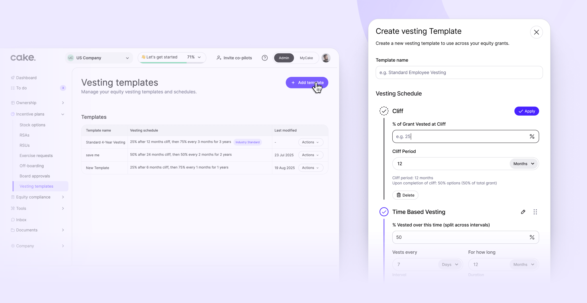 Find your templates easily, manage them centrally, and get to your equity setup faster—all while keeping the flexibility and power Cake's vesting engine is known for.
